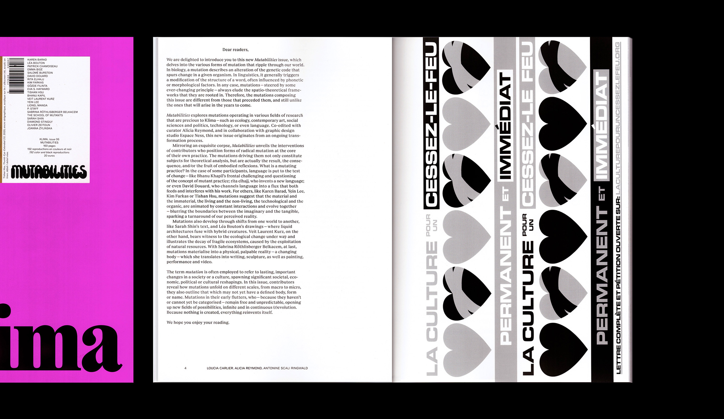 Espace NessClub d'Histoire Locale, website design and development, 2023Catalogue of the exhibition Eleanor Antin, A Retrospective at Mudam Luxembourg. Curator: Bettina Steinbrügge, assisted by Julie Kohn. Editors: Vanessa Joan Müller and Bettina Steinbrügge. Texts: Lisa E. Bloom, Andrea Bowers, Haden Guest, Ingrid Luquet-Gad, Jason McBride, Christiane Meyer-Stoll, Olaf Nicolai, Letizia Ragaglia, Alexandro Segade, Bettina Steinbrügge. Publishers: Mudam Luxembourg, Hatje Cantz. 32 x 24,5 cm. 220 pages, 120 colored photos. Printer: Grafiche Veneziane, 2025Orbi, "On the Other Hand". Workshop and residency program taking place next to Jels, Danemark. An invitation to reconsider what we do three times a day, in the form of a cookbook. Organized with Line-Gry Hørup, Paul Bernhard and Niklaus Mettler, with help from the Orbi association.Piero Heliczer: Poems & Documents, book design. Volume gathering a significant number of Heliczer’s poetic works through facsimile reproduction of his contributions to more than thirty periodicals published between 1958 and 1979. Edited by Benjamin Thorel and Sophie Vinet. Published by After 8 Books. Order here. Edition of 1000. 256 pages, 21.6 x 29.9 cm, 2021Crumbs I'd rather stand, catalogue for Olu Ogunnaike's shows "Crumbs" at CAPC, Bordeaux and "I'd rather stand" at Museum Volkwang, Essen Edition of 500. 128 pages, 21 x 29.7 cm, 2023Visual identity for Dial-A-Poem's website. First launched in 1969 by poet John Giorno, Dial-A-Poem began as a radical experiment: pick up the phone, dial a number, and hear a poem. Working with partners around the world, Giorno Poetry Systems extended this work by recording contemporary poets reading in their native languages. The website brings together Giorno’s original recordings alongside those from each international edition in one accessible space. Coding by Clara Pasteau, 2025Vagabondi Efficaci, book design. Curated by Costanza Candeloro. Published by Prospect Miranda. Offset print, sewn bound, silkscreen on plastic cover. Edition of 250. 180 pages, 12.5 x 18 cm, 2019Invitation postcard, for Rendez-vous, a graphic design event series which took part at TRACé – Centre du Graphisme, Échirolles (France). Curated by Étienne Hervy, 2024The Artificial Kid, campaign identity for the annual curatorial cycle of Elsa Vettier at La Maison Populaire, Montreuil. Fonts by Maxime Selin, 2022Intimate confession is a project, book design. Edited by Jennifer Teets. Co-published by Inventory Press & Blaffer Art Museum. 128 pages, 8 × 10.25 inches, 2024baptistepenetticobra.com, website design and code, for Baptiste Penetticobra, 2022Intimate confession is a project, book design. Edited by Jennifer Teets. Co-published by Inventory Press & Blaffer Art Museum. 128 pages, 8 × 10.25 inches, 2024Ղարիբ ֊ Gharīb Pavilion,identity for the Pavilion of Armenia at the 59th Venice Biennale, for artist Andrius Arutiunian, 2022Sarah Maldoror: cinema tricontinental, free bilingual newspaper accompanying the eponymous exhibition at Palais de Tokyo. Rotative printing, loose binding. Edition of 20,000. 32 pages, format berlinois, 2021Klima n°6, Mutabilities, art and research magazine. Publication direction by Antonine Scali Ringwald and Loucia Carlier. Co-edited with Alicia Reymond. Edition of 500. 160 pages, 20,5 x 29 cm, 2024 Vice Versa "America's Gayest Magazine" (1945), book design. Texts by Lisa Ben. Edited and published by ness Books. Laser print, perfect bound, soft cover. Order via ness books. Edition of 40. 140 pages, 21 x 29,7 cm, 2017 Artwork for LA CULTURE POUR UN CESSEZ-LE-FEU, 2023. Here printed in Klima #06 Mutabilities, 2024The Gharīb Pocketbook, alternate catalogue of the Pavilion of Armenia at the 59th Venice Biennale, for artist Andrius Arutiunian Edition of 1000. 256 pages, 10 x 13.8 cm, 2022Puberté 2, poster series for the exhibition of artist Kevin Desbouis, on a proposal by Franck Balland. Ravisius Textor, Nevers. Inkjet print, 120 x 176 cm, 2019U Kill’d me First (Melody), publication following “Melody”, the installation created by David Douard for the 2022 edition of Sculpture Garden (Geneva). Edition of 500. 52 pages, 21 x 29,7 cm, 2022. Published by Ness Books, order here.La Magie, book concept and design. Texts by Margot Delalande, Kazuki Fujita, Maud Gourdon, Camille Lamy, Jean Lesca, Marion Molle, Aurélien Potier. Published by Résidence La Verrerie. Offset print, perfect bound, soft cover, pantone and lamination. Order via ness books. Edition of 150. 68 pages, 18.5 x 26 cm, 2020Deux pierres retrouvées d’Amedeo Modigliani, book design. Concept and text by artist Christophe Lemaitre. Edited and published by Tombolo presses. Offset print, section sewn, soft cover with flaps. Order here. Edition of 350. 104 pages, 13,6 x 18 cm, 2019 (documentation by Aurélien Mole)ComingSoon, catalogue for collective exhibition for Lafayette Anticipations. The publication includes curatorial notes about each work, a text by Rebecca Lamarche-Vadel, curator of the exhibition, and essays by Olivier Zeitoun, Kallado-Mcdowell, Sandrine Gasparine Alexandre, Kara Keeling, Martine Syms and Ama Josephine Budge Johnstone. Edition of 900. 144 pages, 24 x 34 cm, 2024For an Investigation of Fictional Futurities, book design. Archive edited by Nelson Beer. Published by ness books. Black riso print, spiral bound, thick cover with sticker, ticket insert and plastic wrap. Order via ness books. 200 pages, 21 x 29,7 cm, 2018Country Lesbians, The Story of the WomanShare Collective, 208 pages. Co-publishers: Ness Books and Shmooks Format: 14 x 21,6 cm, 2024Naïve Gossip Theory, book design. An essay by Gianmaria Andreetta. Black riso print, glue bound, offset cover. Order via ness books (sold out). 80 pages, 13 x 18 cm, 2016U Kill’d me First (Melody), publication following “Melody”, the installation created by David Douard for the 2022 edition of Sculpture Garden (Geneva). Edition of 500. 52 pages, 21 x 29,7 cm, 2022. Published by